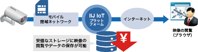 一般的にはローカルにネットワークビデオレコーダーなどを設置してデータを保存しますが、IIJ IoTサービスでは月額7円/GBの低コストなクラウドストレージをご利用いただけます。