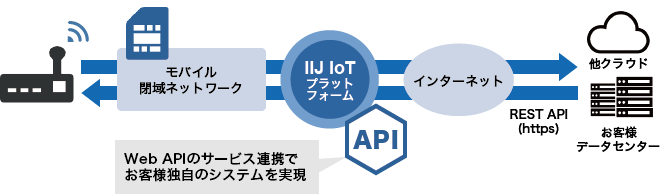 プラットフォーム機能はすべてWeb APIを利用して設定・操作・実行が可能。お客様システムとIIJ IoTサービスを連携させることで、お客様独自のIoTシステムを構築できます。